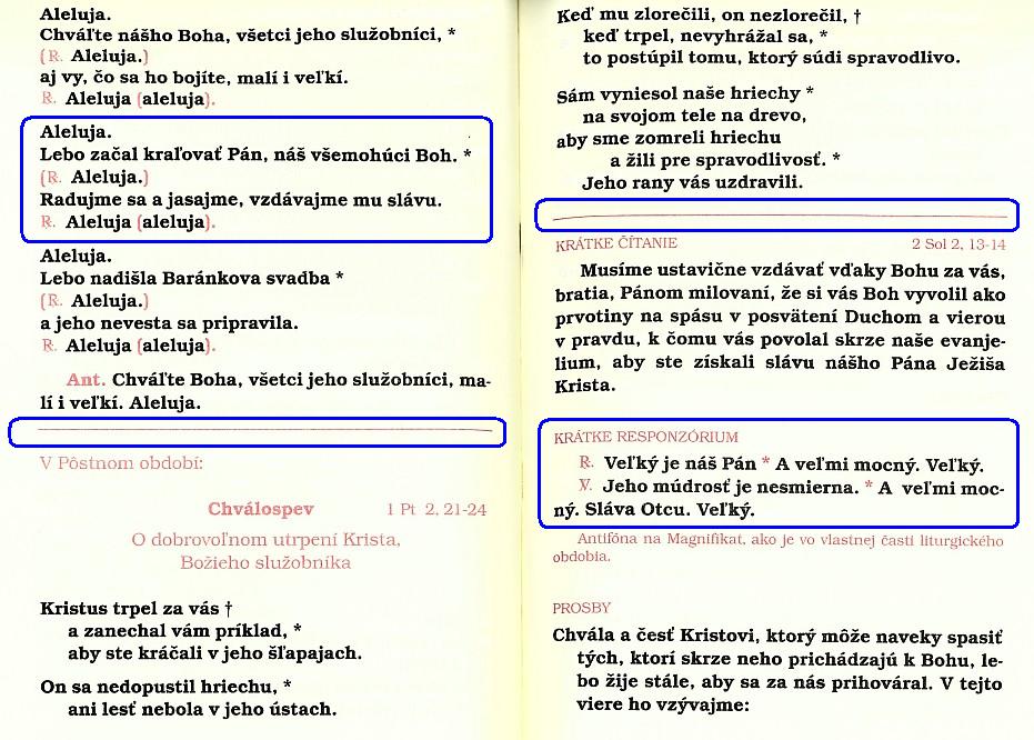 V texte na str. 1216-1217 jednozväzkovej Liturgie hodín (vydal SSV, 2009) sme znázornili použitie tenkej horizontálnej červenej čiary, ktorá oddeľuje text používaný alternatívne (uvedený hymnus sa používa len v pôstnom období, ako naznačuje aj príslušný popis rubriky).